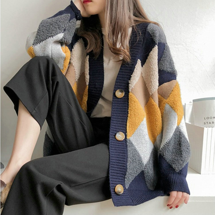 Colorful Plaid Knit Cardigan Lady Lont Sleeve Sweater DL21012